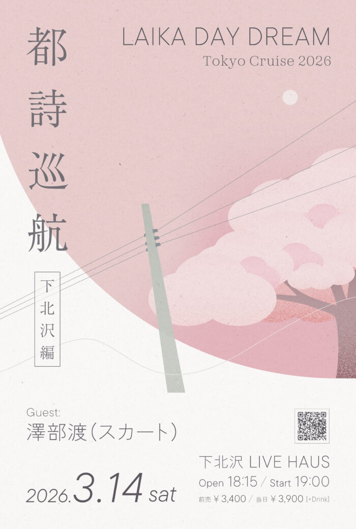 2026.3.14(SAT) 東京都 下北沢 LIVE HAUS 『LAIKA DAY DREAM Tokyo Cruise 2026 『都詩巡航』下北沢編』 OPEN / START 18:15 / 19:00 LIVE 出演:LAIKA DAY DREAM、澤部渡 (スカート) ▼ticket https://forms.gle/D9GUYMzZ2YSNYtUy6