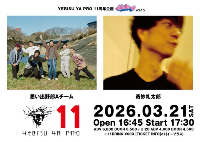 2026.3.21(SAT) 岡山県 YEBISU YA PRO 『YEBISU YA PRO 11周年企画「でえれ〜!! Vol.15」』 OPEN / START 16:45 / 17:30 TICKET https://eplus.jp/sf/detail/4143300010?P6=001&P1=0402&P59=1