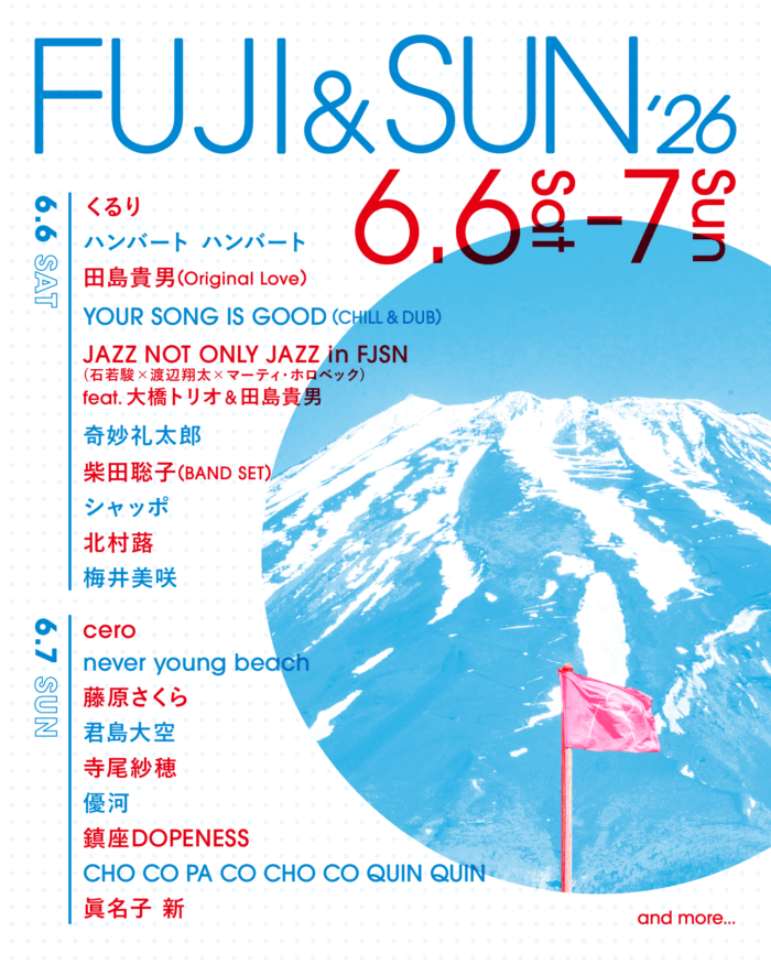 2026.6.6(SAT)-2026.6.7(SUN) 静岡県 富士山こどもの国 『FUJI & SUN' 26』 TICKET https://fjsn.jp/ LIVE YOUR SONG IS GOOD(CHILL & DUB)はDAY1 6/6(土)に出演します。 シャッポはDAY1 6/6(土)に出演します。 ceroはDAY2 6/7(日)に出演します。 INFO https://fjsn.jp/