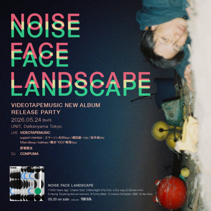 さらに、5/24に代官山UNITで開催が決定している『NOISE FACE LANDSCAPE』のリリースパーティーに、折坂悠太の出演が決定。VIDEOTAPEMUSICとしては国内では約1年半ぶりのバンドセットでのライブ披露となるほか、DJでCOMPUMAが出演します。